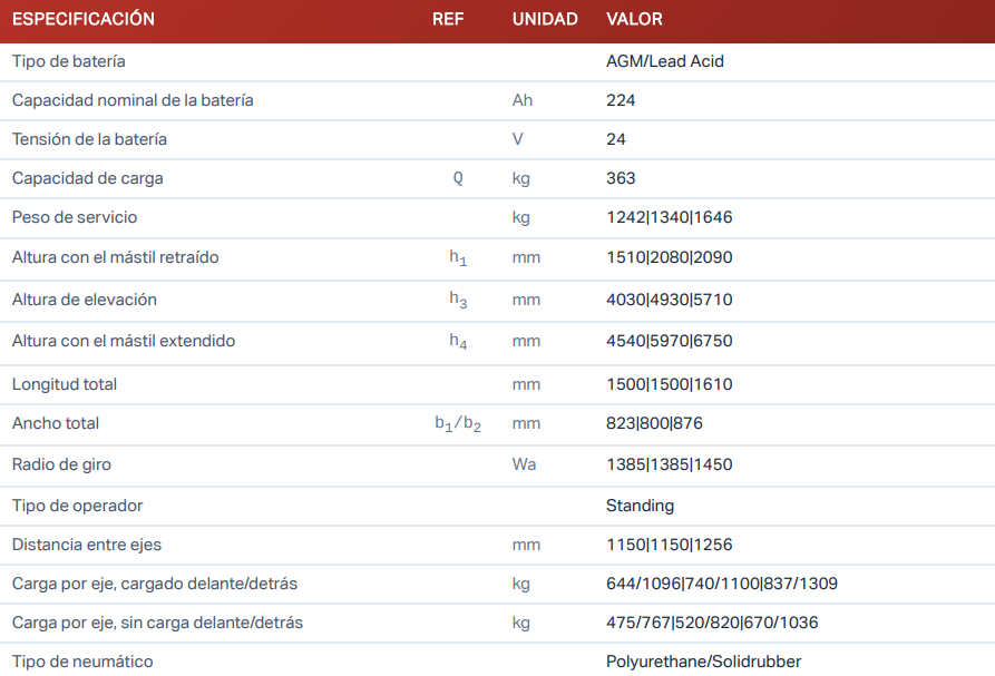 La JX1 combina dimensiones compactas con un excelente rendimiento de picking. Con una altura máxima de plataforma de 4,8 m y una altura de picking de 6,3 m, garantiza el acceso a estanterías de nivel medio en almacenes. Su capacidad de carga de 0,5 T, su batería de 24 V/224 Ah y su radio de giro compacto de tan solo 1385 mm la convierten en una solución ágil y eficiente para la preparación de pedidos en espacios reducidos.